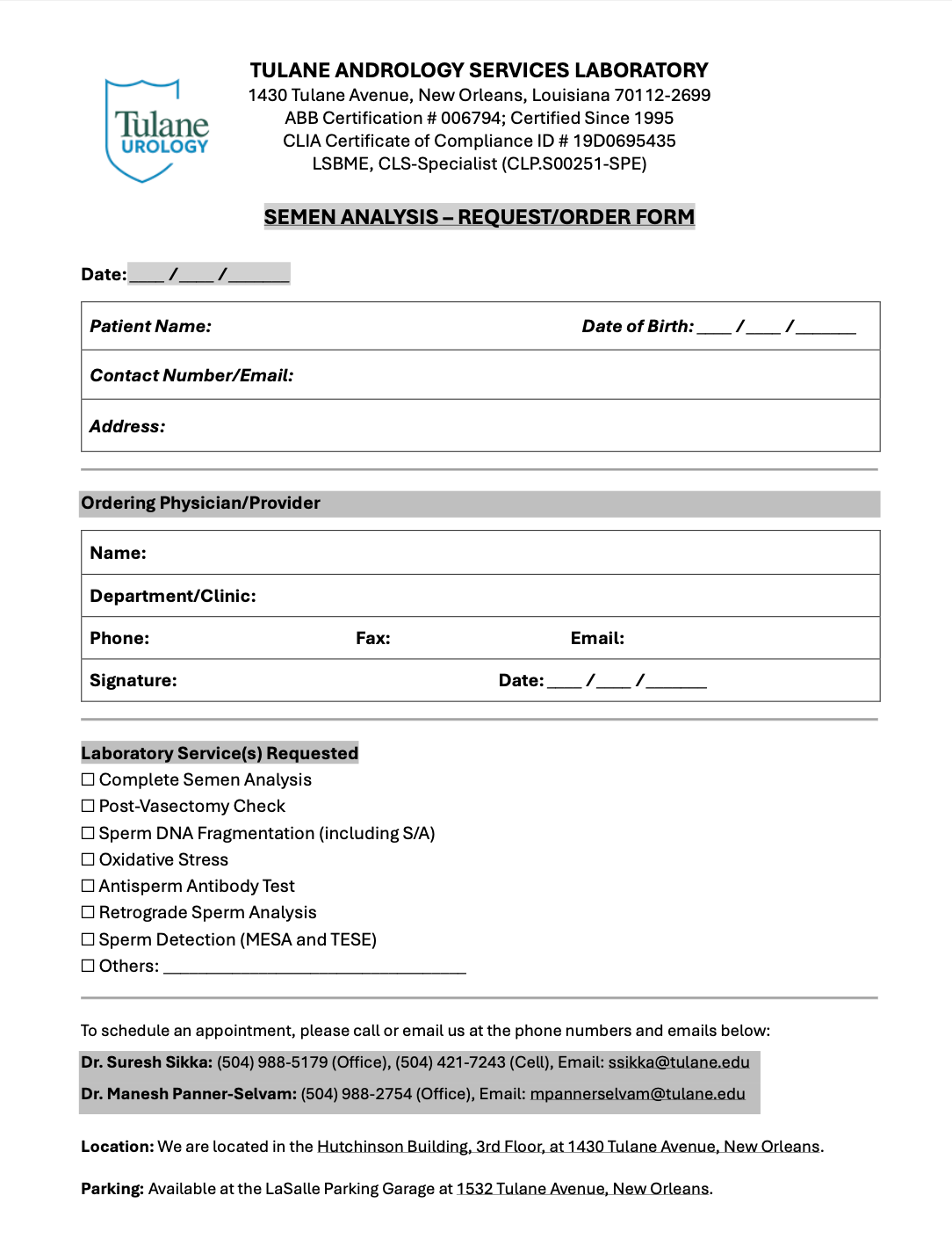 The Andrology Clinic Laboratory at Tulane University School of Medicine in New Orleans offers a range of specialized tests and consultation services for the evaluation of male infertility. In addition, we provide training in standardized semen analysis and quality control management, mainly for FDA-required drug safety clinical trials sponsored by pharmaceutical industries. Our laboratory has been certified by the Clinical Laboratory Improvement Amendments (CLIA) since 1995 and is equipped with the latest technology, including an AI-based Computer Assisted Semen Analysis (CASA) system.